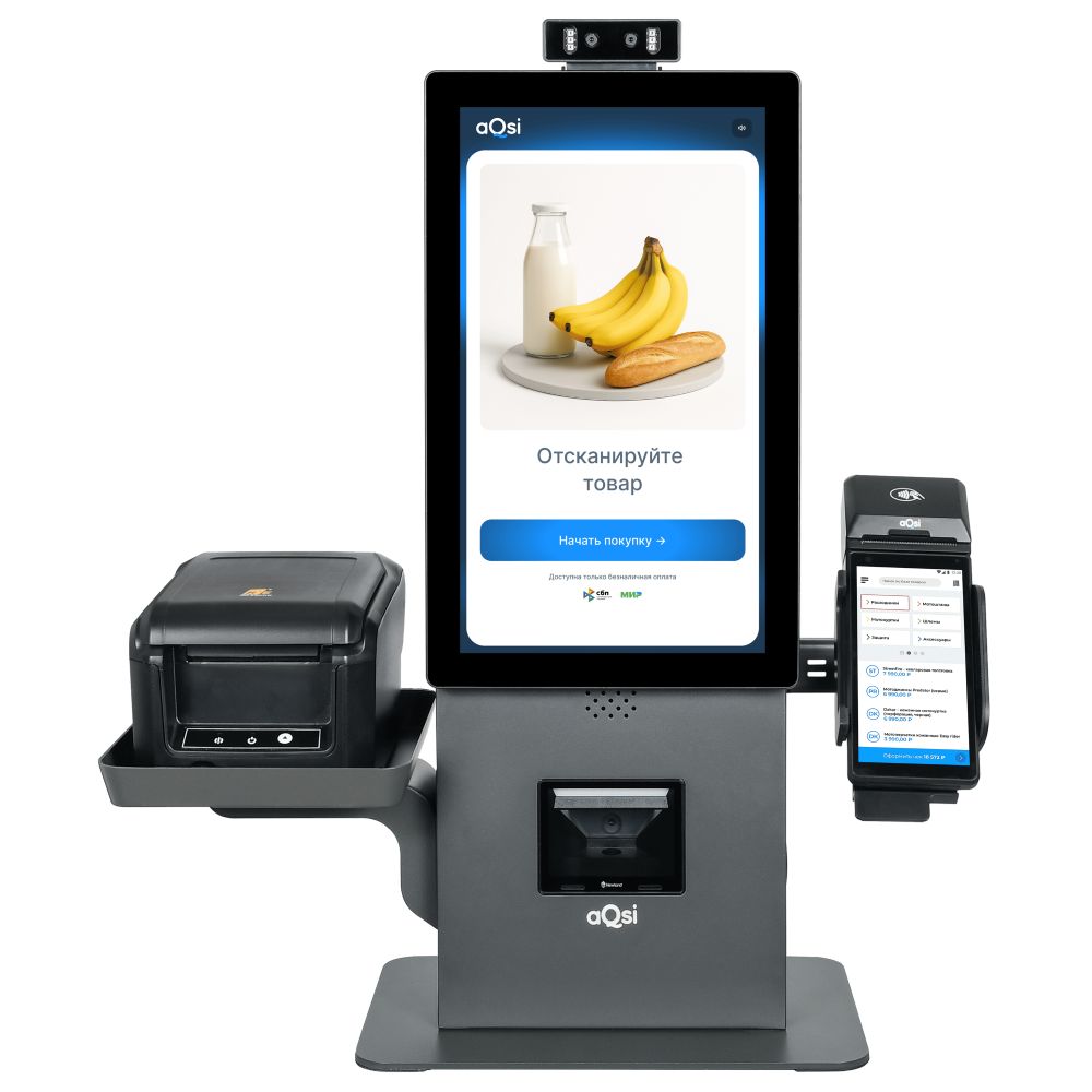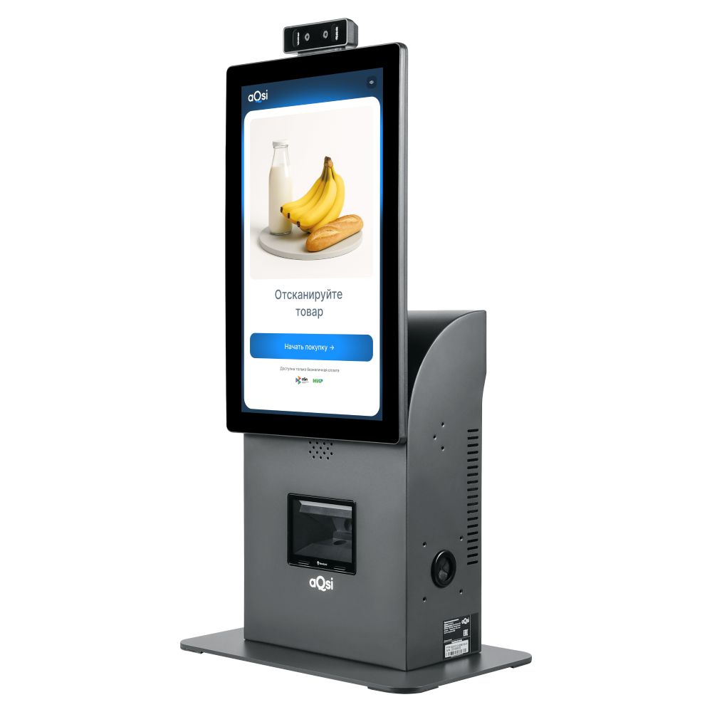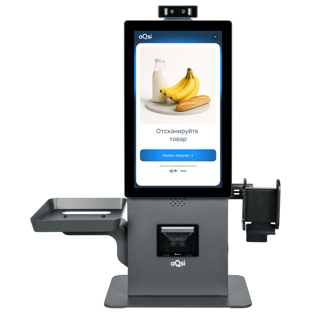 Касса самообслуживания aQsi TC 156 позволяет покупателям самостоятельно сканировать товары и оплачивать покупки без участия кассира.