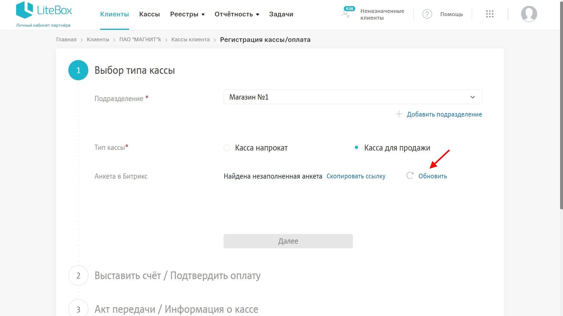 ⚡ При регистрации Кассы для продажи, верификация на основе заполнения анкеты осуществляется на усмотрение Партнера. Однако, анкета является доказательством получения от Клиента данных для регистрации ККТ в ФНС и ОФД, что может быть полезно при разрешении спорных ситуаций.